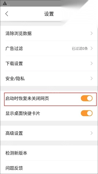 随后,将“启动时恢复未关闭网页”的滑动按钮向右滑动,滑动结束后,即可开启启动时恢复未关闭网页的功能。