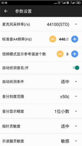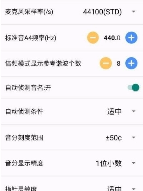 1. 提供内容丰富的多种参数设置列表,其中包含示波器灵敏度、音分显示精度以及音分刻度范围等。
