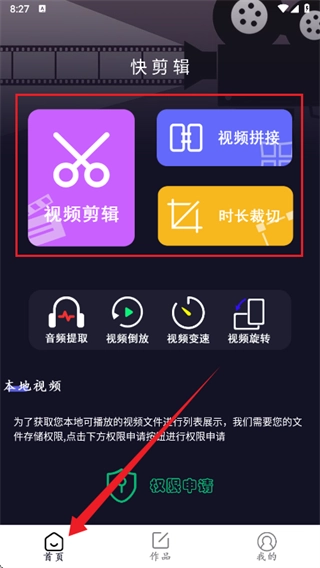 2. 首页具备视频剪辑、视频拼接以及时长裁切等功能。