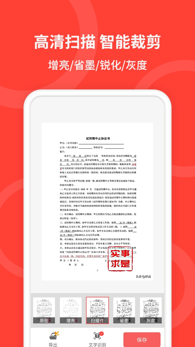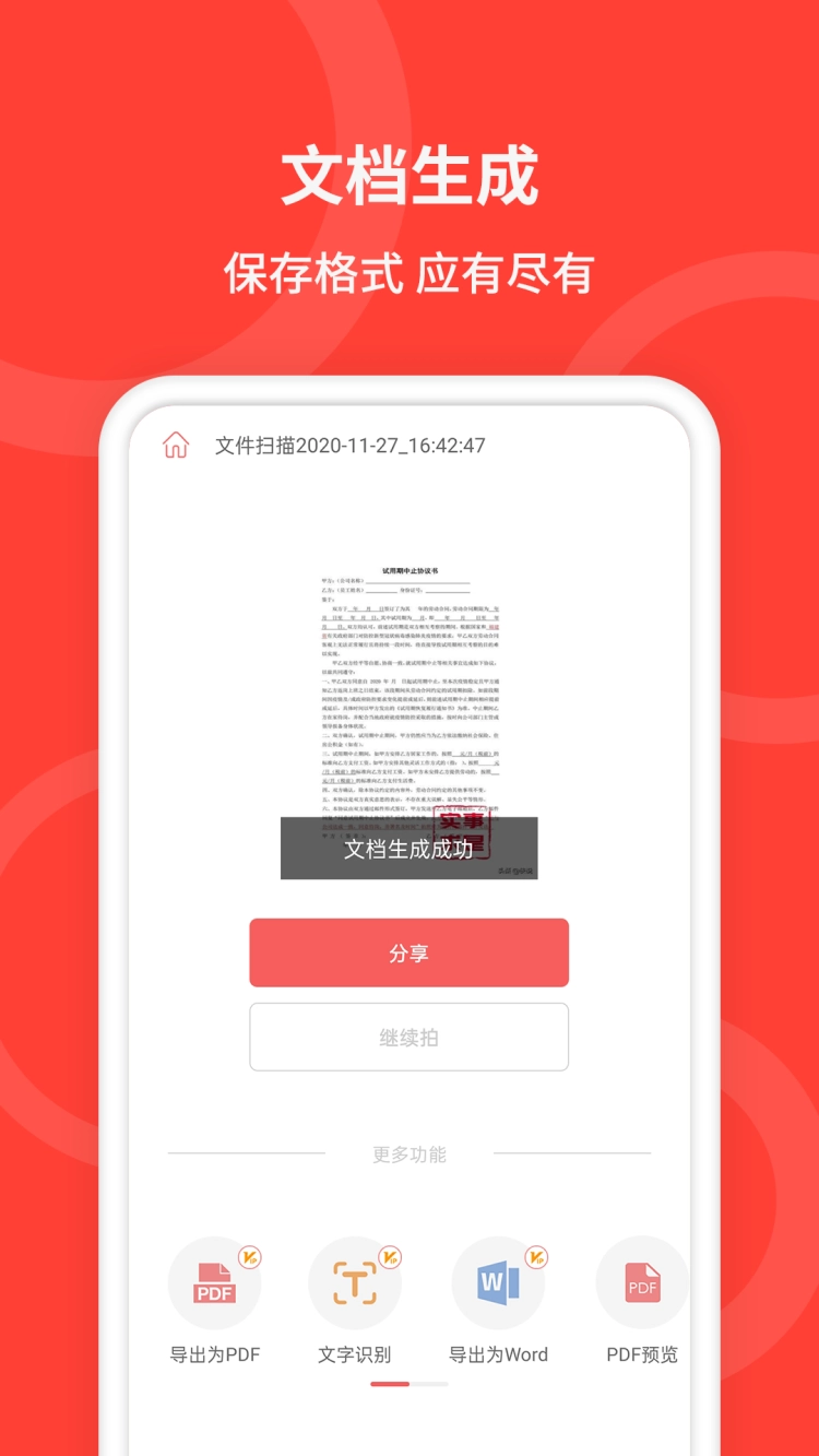•文档扫描:能够智能识别文档,并生成扫描件,支持以pdf格式分享与导出。