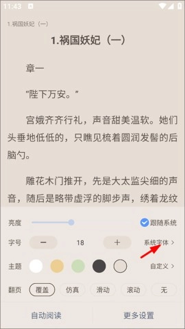 3、进入设置,对阅读亮度、字体大小、主题以及翻页模式进行调整,最终选取系统字体。