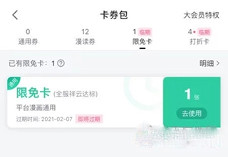 限免卡属于一种道具,能够用来免费阅读付费章节。使用一张限免卡,就能解锁一话付费章节,且享有三天的阅读期限,不过这一话无法进行购买。