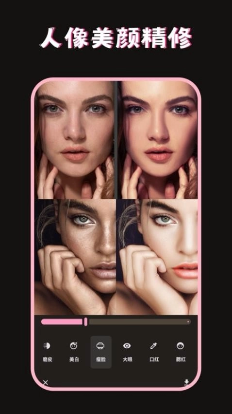 1无论是实现祛痘、瘦脸,还是打造大眼效果,都能以自然的方式呈现,有效避免因过度修图而产生的假面感。