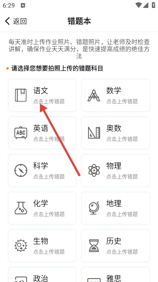 您可以在页面底部找到“上传错题”按钮,点击后即可开启语文错题的拍照上传步骤。