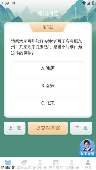 进入诗词问答界面后,借助答题这一形式,能够掌握更多的诗词知识。