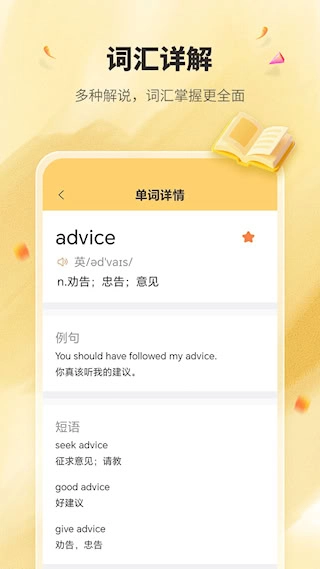 用户可以通过点击或长按操作获取词汇解析,同时系统会展示相关例句并播放发音,帮助用户更深入地理解词义和掌握标准读音。