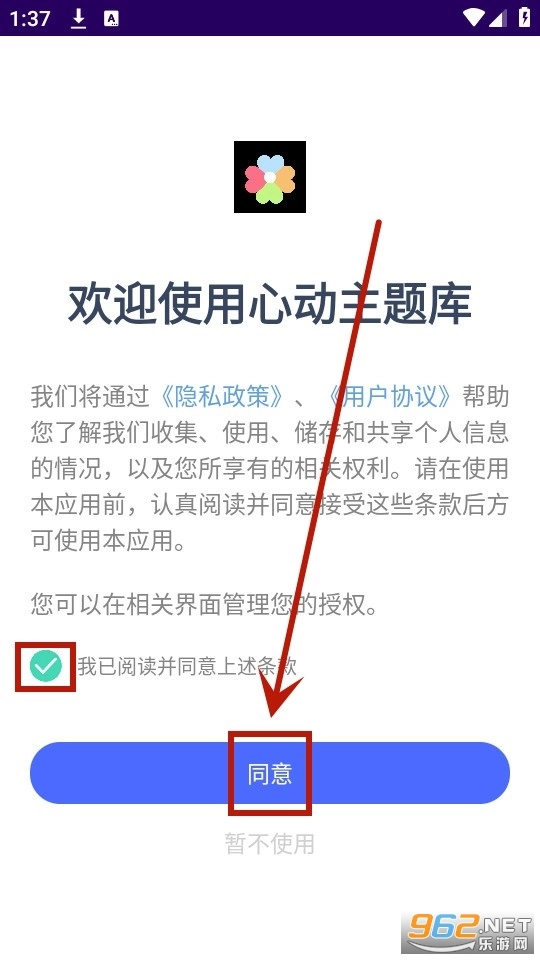 先安装心动主题库,安装完成后打开它。接着勾选相关协议,然后点击同意按钮以确认同意隐私政策。
