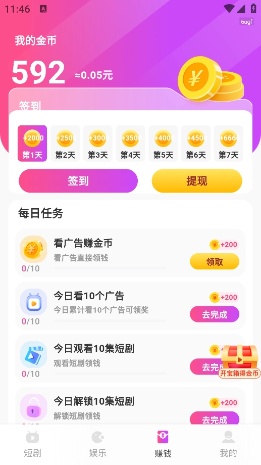 看短剧赚金币:只要观看指定数量的短剧视频,就能触发金币任务,完成任务就能拿到金币。广告任务的金币数量和账号活跃度有关,活跃度越高,能拿到的奖励说不定会更多。