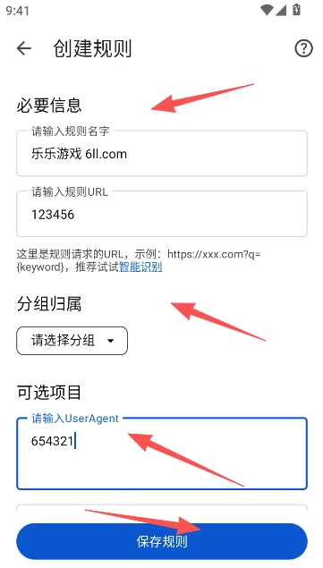 4、补充创建规则所需的必要信息:包括规则名称、规则URL链接、分类归属以及可选项目等内容,填写完毕后点击保存规则按钮。