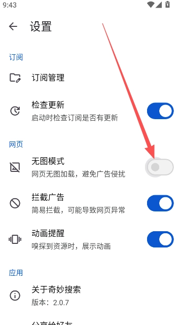 2、找到网页栏的无图模式选项,点击图标按钮开启。