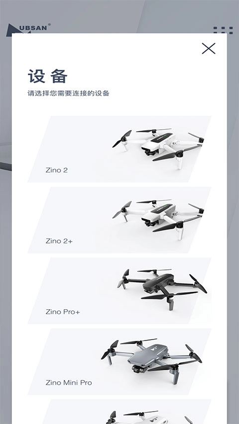 2、账号登录成功后,在首页点击“无人机”选项,接着依据您所购买的无人机型号挑选对应的设备(当前该软件支持的设备有Zino 2、Zino 2+、Zino Pro+、Zino mini Pro、Zino mini SE、Zino mini、HUBSAN MINI、ACE SE和HUBSAN ACE)。