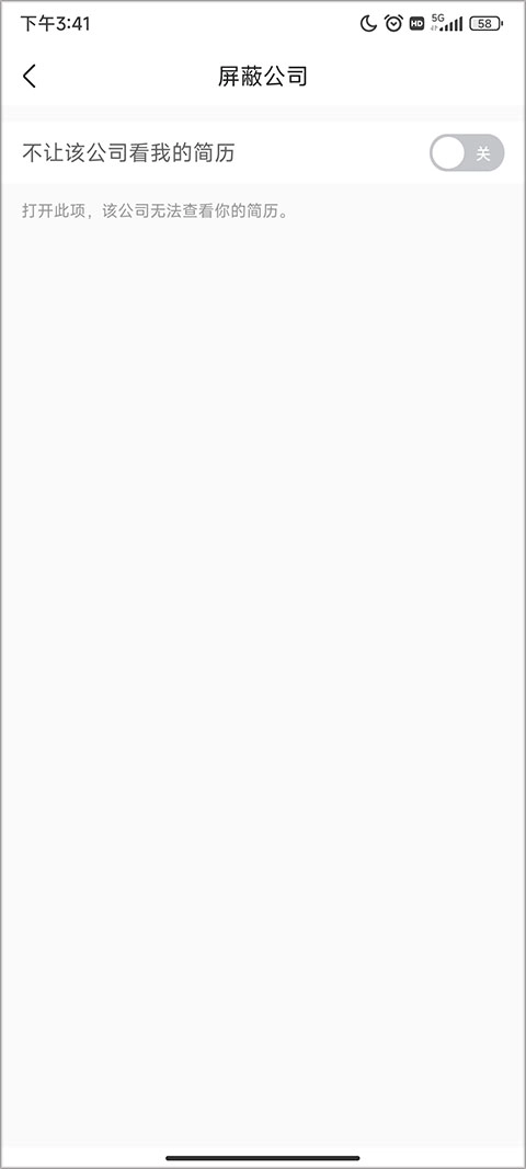 4、进入屏蔽功能页面后,开启“不让该公司查看我的简历”对应的开关按钮。