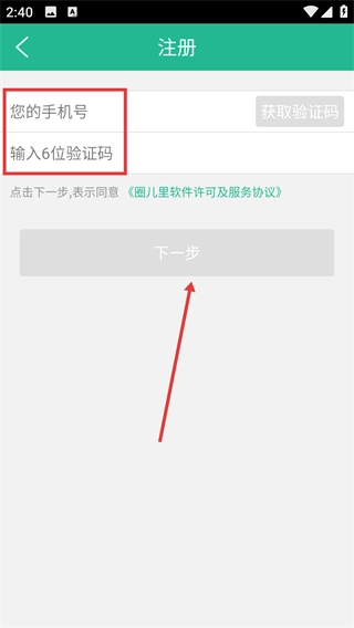 2、进入注册页面后,首先填写【您的手机号】这一栏,接着点击【获取验证码】按钮,把收到的6位验证码输入到对应的输入框中,完成这些操作后就可以点击下一步了。