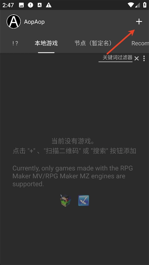 1、第一步先打开AOPAOP模拟器,接着点击界面右上方的加号按钮,然后找到对应的游戏文件夹。