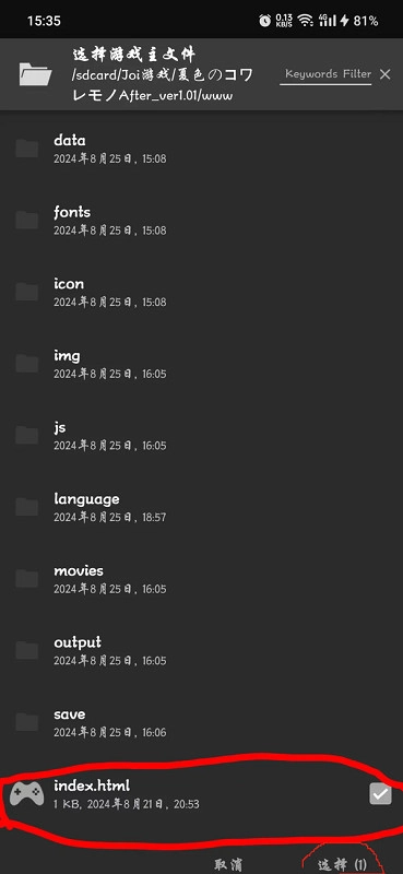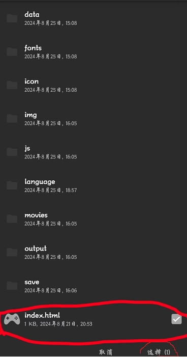 请注意:找到目标文件夹中的www文件夹,打开该文件夹后,选择后缀为HTML的游戏文件进行添加操作,这类文件通常在左侧会显示游戏手柄的标志。完成选择后,点击右下角的“选择添加”按钮即可。