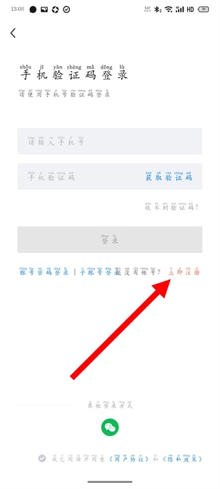 1、在手机验证码登录界面,点击“立即注册”按钮,即可跳转至注册页面。