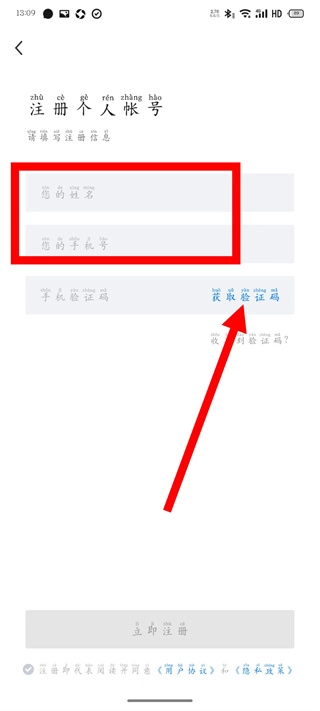 4、把收到的验证码填写到对应的输入框里,勾选相关协议后,点击“立即注册”按钮,这样就完成操作了。
