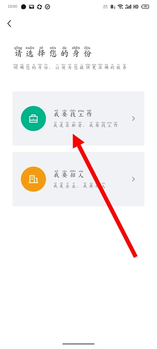 2、在身份选择页面,点击“我要找工作”选项,即可进入个人账号注册界面。