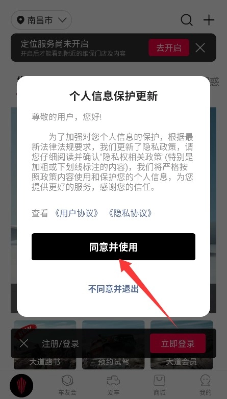 1、首次启动时,系统会显示服务条款说明,阅读完毕后点击同意并使用进入。