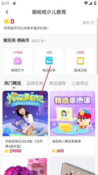 进入画啦啦少儿美术后,点击画币商城选项,即可进入画币兑换页面。