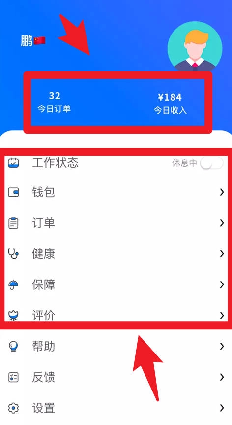 5、进入个人中心时,骑手可以清楚查看当天完成的订单数量及收入情况,并能随时管理各类功能。