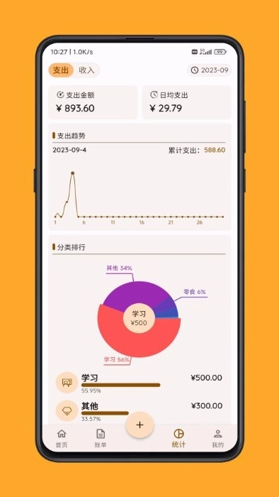 每月会整理出一目了然的统计报告,让您能清楚掌握当月的资金流入总和、流出总和以及剩余金额情况。