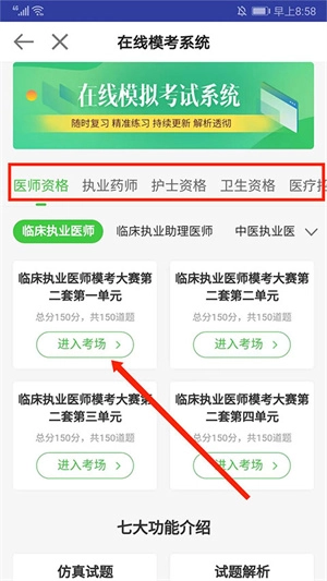 进入模考刷题界面后,会看到“医师资格”“执业药师”“护士资格”“卫生资格”“医疗招聘”等多个大类。接下来选择所需的刷题分类,这里我们以医师资格类别下的“临床执业医师”为例,点击“进入考场”选项即可。