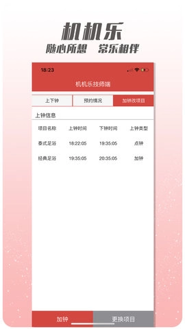 机机乐技师端提供了加钟更改项目的功能,在足浴按摩行业,客户的需求常常是多变的,技师需要根据客户的要求进行加钟或者更改项目。通过软件,技师们可以随时随地进行加钟和更改项目的操作,无需再通过繁琐的人工沟通。这不仅提高了工作效率,也为客户提供了更加灵活的服务。