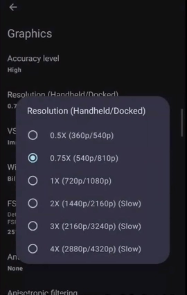 3、为了提升性能表现,分辨率建议一直设置在较低的0.75倍。要是您使用的是配置相对普通的低端手机,选择0.5倍的分辨率会更为合适。