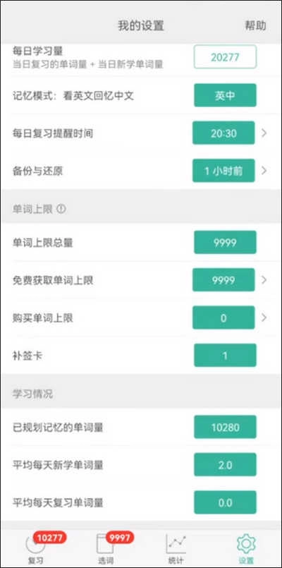 2、选好学习类型后,默认的英语单词学习数量是30个,你可以根据自身学习能力调整这个数量,具体操作是点击“我的”,然后在每日学习量设置项里修改数字就行。
