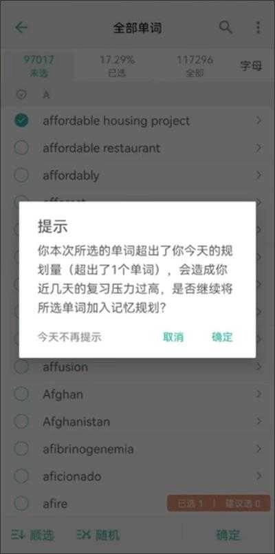 2、接着在下方的书籍列表里挑选自己想更换的书,进入该书的单词列表页面后,任意勾选一个单词,然后点击【确定】按钮。