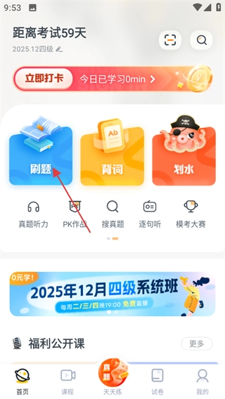 进入粉笔四六级首页,点击刷题,进入刷题页面。