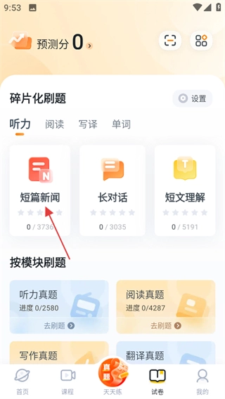 在刷题页面找到“短篇新闻”选项并点击,即可进入短篇新闻的刷题准备界面。