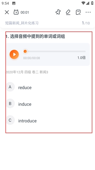 在练习页面中,先播放音频,再依据音频里的内容挑选出正确的单词或者词组。