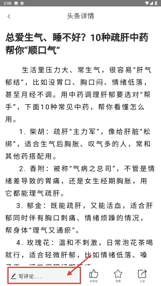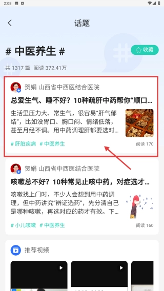 在文章列表里,点击像《总爱生气、睡不好?10种疏肝中药帮你‘顺口气’》这样的目标文章,就能进入文章详情页面。