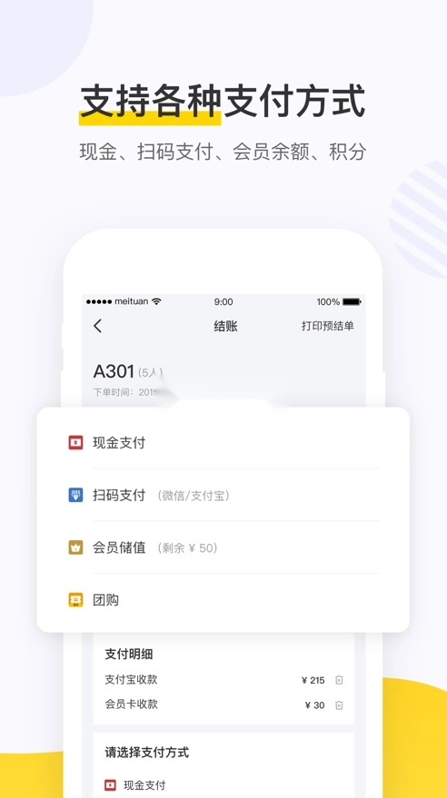 美团餐饮系统智能版,餐饮行业实用的办公软件,软件拥有搜索,点餐等功能,并支持多种支付方式,可以帮助更好的餐饮经营管理