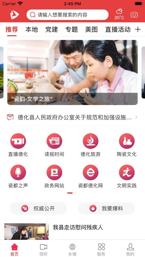 “瓷都德化”是德化县融媒体中心推出的移动客户端,它以服务政府、群众和企业为出发点,整合了全县各部门与各乡镇的资源,致力于打造一款真正属于德化人自己的移动应用。该客户端融合了新闻宣传、政务发布、医疗挂号、直播点播、便民服务等多种功能,构建起一个“智慧城市”服务平台,切实实现了政务、服务与媒介的深度融合。