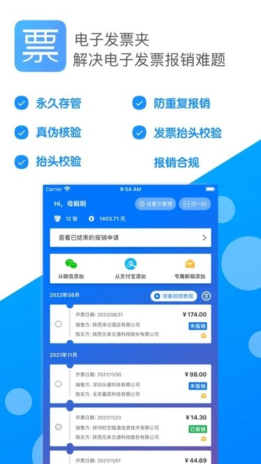 电子发票夹是一款面向个人与企业的电子发票管理工具。借助它,企业无需调整现有的纸质报销流程,就能妥善处理电子发票报销过程中遇到的各类问题。