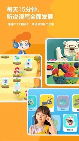 1、孩子们每天仅需投入15分钟,就能在听、说、读、写等各个维度实现全面发展,尽情领略海量学习资源所带来的乐趣。