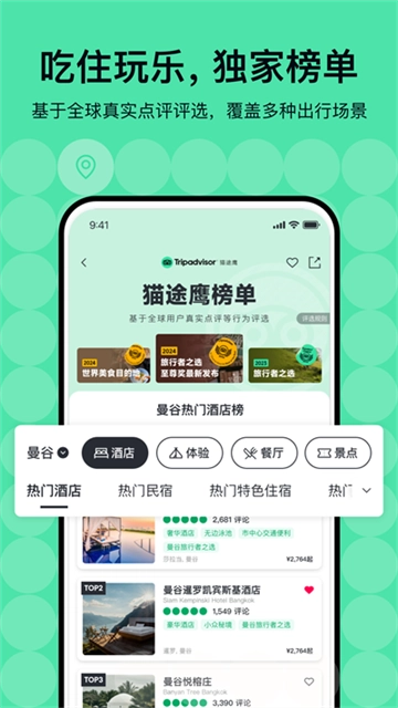 Tripadvisor猫途鹰作为一款在线旅行数据产品,定位类似垂直领域的大众点评,它收录了全球海量旅行信息,超5亿全球旅人在此上传真实点评,提供190多个国家的旅人及城市指南,从出行前筹备到旅行途中都持续给予数据支持,助力中国出境游客节省大量精力。该软件依据中国用户群体使用习惯,界面采用扁平化布局设计,既方便用户快速查找全球旅游目的地与酒店排行榜等内容,又能满足用户随时随地查阅、撰写旅游点评等需求,全方位提升用户旅行前、中、后期的旅游体验。以往,我们可能因一张照片觉得某个地方很美,便决定前往,可到了之后却发现实际模样与照片大相径庭。而用户点评能让我们在出发前就真切了解目的地情况,同时,分享自己的点评也能让下一位用户拥有更好的旅行经历。所以,对于手机用户,尤其是近期打算出门旅游的人来说,Tripadvisor猫途鹰这款软件十分必要,千万别忘下载使用。