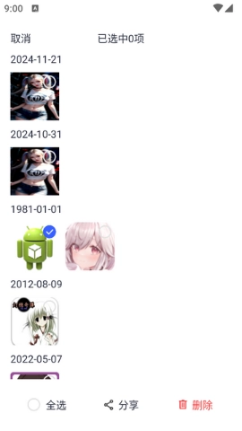 进入照片列表后,你可以对照片进行批量管理操作,比如执行【删除】或【分享】等功能。