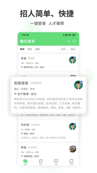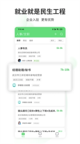 武汉直聘App每日都会更新海量真实可信的招聘信息,助力用户抓住求职机遇,更轻松地完成应聘流程。用户能够根据自身需求设定目标区域来搜索工作,还能和招聘方在线上直接沟通交流,无论何时何地都能找到契合自己的岗位。另外,企业也可以在这个平台上发布招聘需求,从而获取到优质的人才资源。