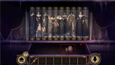 9、返回大厅,向前行进,点击右侧书架,把刚刚获取的书放入其中并调整顺序,拼接成完整画面,进而得到抽屉把手。