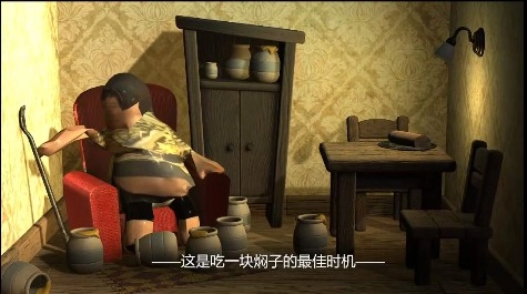通过手中的棍子等道具,去将桌子上的焖子拿到手。