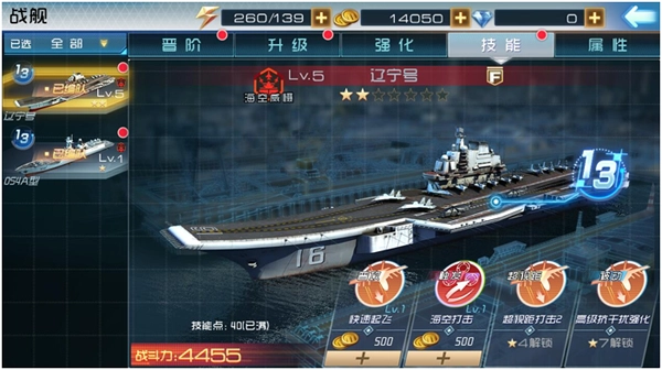 战舰的普通攻击技能、触发类技能(2星解锁)、超视距打击技能(4星解锁)以及被动类技能(7星解锁);