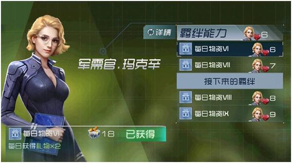 军需官玛克辛的10个进阶项目依次为每日物资I至每日物资X。其中,每日物资VI对应的是每日获得礼物2,这是整个指挥部最需要优先升级的指标!其他进阶项目提供的多是战舰图纸、配件、进阶箱子等普通必需品,在此就不赘述了。