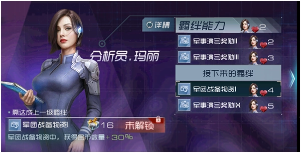 因为礼物数量不足,暂时无法解锁后续的羁绊内容,还请各位自行想象补充。这里面包含5个进阶项目,具体是军事演练1到4级,以及军团物资1级。简单来说,就是军事演练的各项奖励会提升30%,军团相关的各项奖励能增加50%。不过解锁这些需要的礼物数量较多,建议等礼物储备充足后再进行解锁操作。