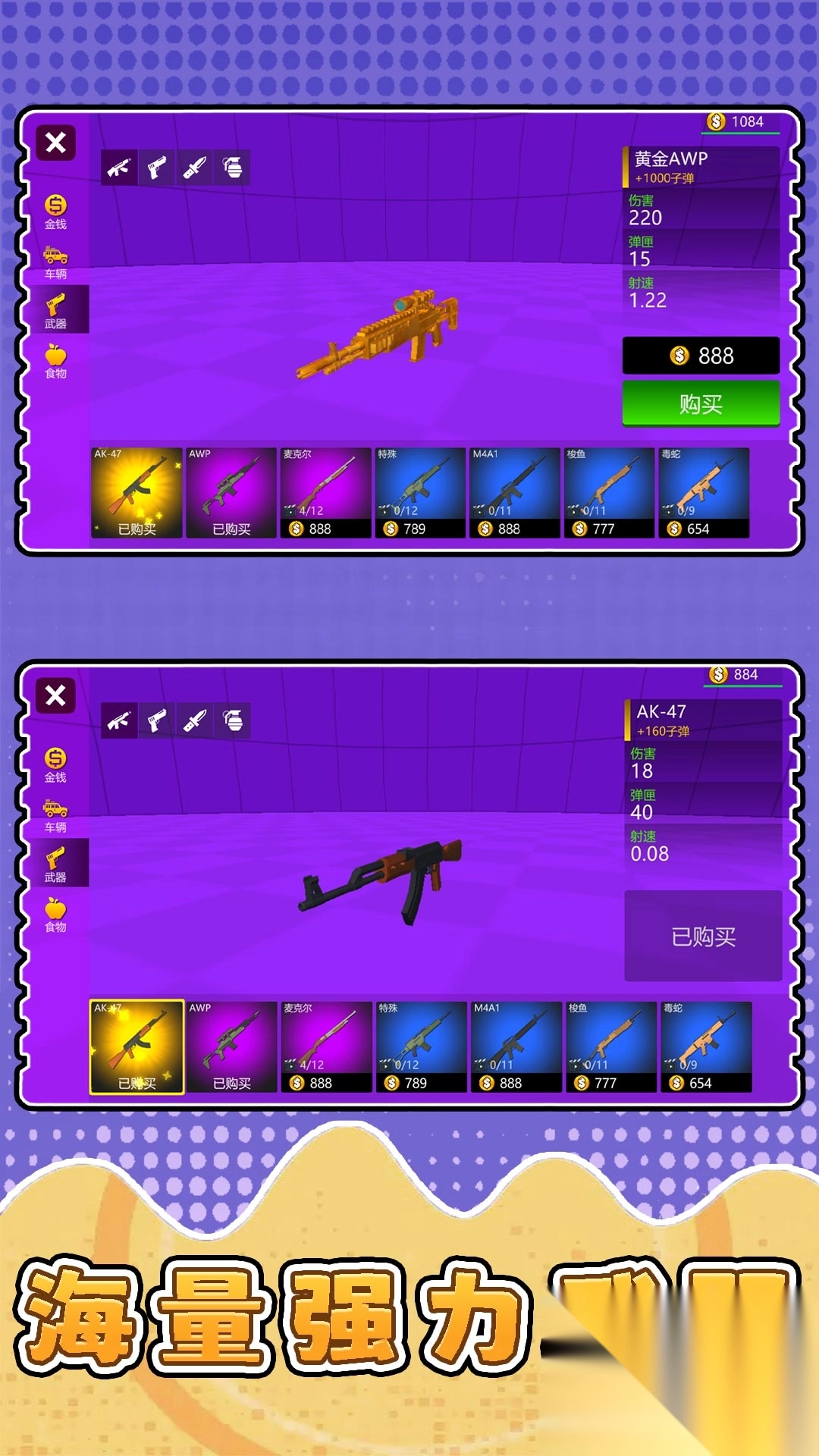 1. 游戏里有着丰富多样的武器选择,无论是常规枪械还是新奇搞怪的道具都能找到,玩家能够自主搭配装备组合,让战斗过程变得更具趣味性与观赏性;