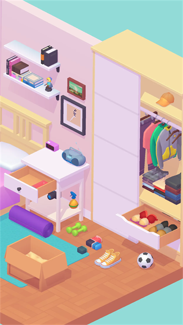 unpacking游戏采用治愈系卡通画风,玩法简单轻松,只需通过点击和拖动操作进行整理,在不同的小房间里按照自己的想法自由体验,解压又有趣,是一款内容丰富的收纳整理解压游戏。