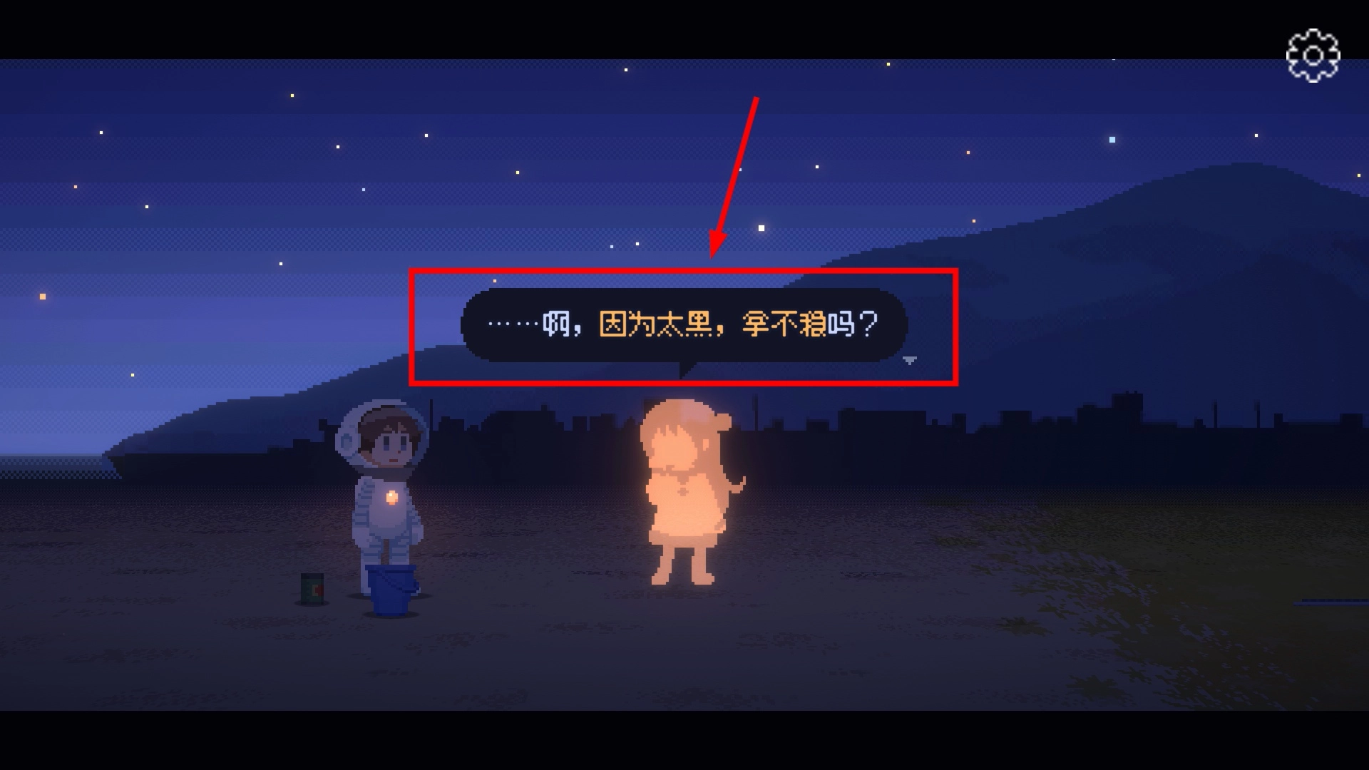 1、夜晚场景中角色对话提示太黑拿不稳物品,需关注场景中的可交互元素,寻找能提供光亮的道具推进解谜。